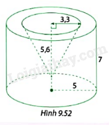 Từ một khối gỗ hình trụ bán kính đáy 5 cm và cao 7 cm, người ta khoét đi một phần gỗ của hình nón có bán kính đáy 3,3 cm và chiều cao 5,6 cm (Hình 9,25). Tính thể tích phần còn lại của khối gỗ.