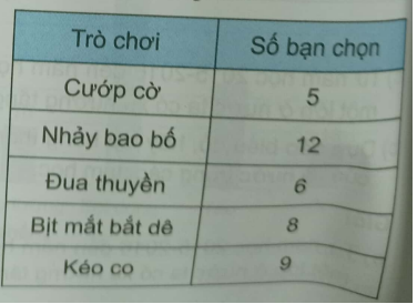Lớp 6A dự định tổ chức một trò chơi dân gian khi đi dã ngoại. Lớp trưởng đã yêu cầu mỗi bạn đề xuất một trò chơi bằng cách ghi vào phiếu. Sau khi thu phiếu, tổng hợp kết quả lớp trưởng thu được bảng sau: