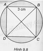 Cho hình vuông ABCD có cạnh bằng 3cm và nội tiếp đường tròn (O) như Hình 9.8. Tính tổng diện tích của bốn hình viên phân được giới hạn bởi các cạnh hình vuông (phần tô đậm trong hình).