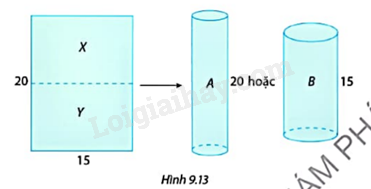 Từ một tấm bìa hình chữ nhật với đồ dài hai cạnh là 20 cm, 15 cm có thể cuộn lại và dùng băng dính dán thành hình trụ A hoặc hình trụ B (không có nắp) như Hình 9.13.