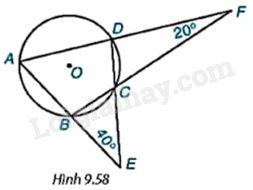 Cho tứ giác ABCD nội tiếp đường tròn (O), AB cắt CD tại E, AD cắt BC tại F như Hình 9.58. Biết (widehat {BEC} = {40^o}) và (widehat {DFC} = {20^o}), tính số đo các góc của tứ giác ABCD.