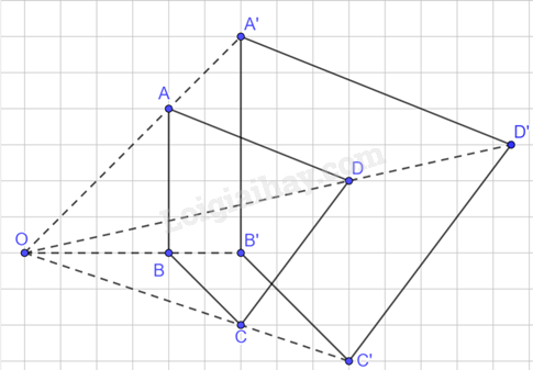 Trên các tia OA, OB, OC, OD lần lượt lấy các điểm A’, B’, C’, D’ sao cho \(OA' = \frac{3}{2}OA;OB' = \frac{3}{2}OB,OC' = \frac{3}{2}OC,OD' = \frac{3}{2}OD\). Vẽ các đoạn thẳng A’B’, C’D’, B’C’, D’A’ ta được tứ giác A’B’C’D’ là hình đồng dạng phối cảnh của tứ giác ABCD với tâm phối cảnh là O và tỉ số đồng dạng là \(\frac{3}{2}\)