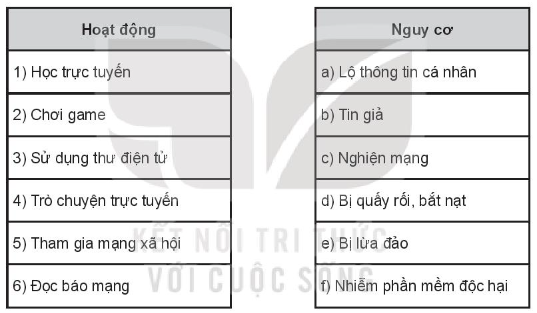 Em hãy cho biết mỗi hoạt động ở cột bên trái có thể gặp những nguy cơ nào ở cột bên phải trong bảng dưới đây.