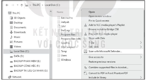 - Chỉ với nhiệm vụ quét virus và các nguy cơ khác trên một thư mục thì cách đơn giản nhất là dùng File Explorer tìm thư mục đó. Sau đó nháy nút phải chuột, chọn chức năng Scan with Microsoft Defender...