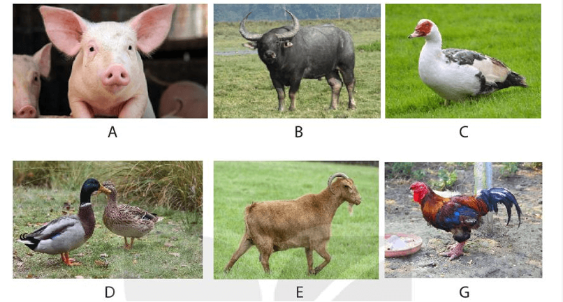 Quan sát các hình ảnh sau đây và ghi tên từng vật nuôi vào đúng ô gia súc hay gia cầm.