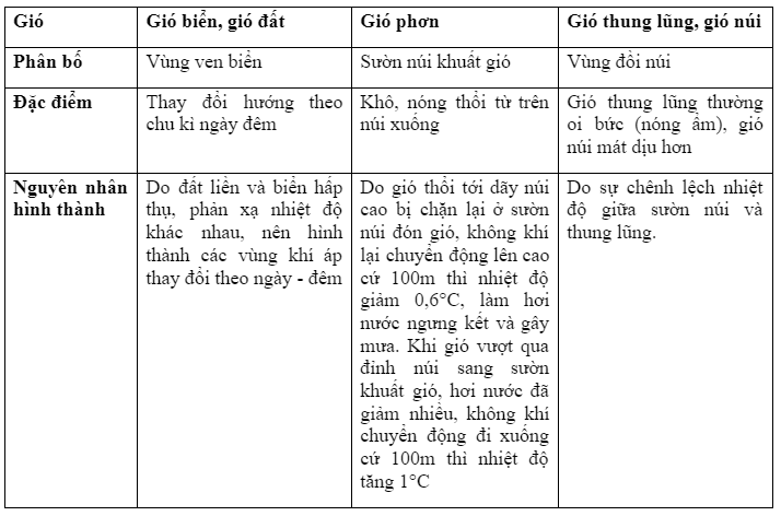 - Gió mùa thổi theo mùa, gồm gió mùa mùa đông và gió mùa mùa hạ. Hướng gió thổi ở 2 mùa trong năm ngược chiều nhau. Gió mùa mùa hạ thường có tính chất ẩm và gây mưa lớn, gió mùa mùa đông thường lạnh và khô.