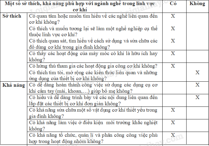 Dựa vào một số gợi ý ở Bảng 9.4, hãy lập bảng liệt kê những sở thích và khả năng của bản thân có thể phù hợp đối với ngành nghề trong lĩnh vực cơ khí.