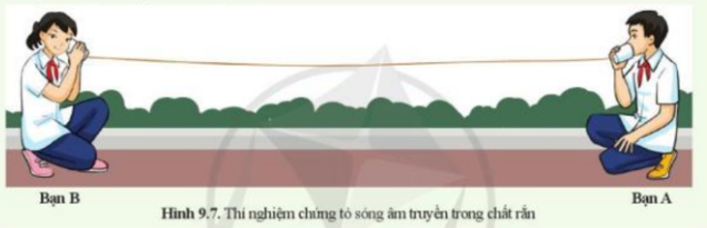 Trong thí nghiệm hình 9.7, khi áp cốc vào tai mình, bạn B nghe được tiếng nói của bạn A, âm đã truyền đến tai bạn B như thế nào? |
