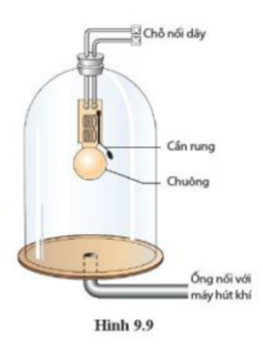 | Một chuông điện được đặt trong một bình thủy tinh kín H 9.9. Cho chuông điện kêu rồi dùng máy bơm hút dần không khí ra khỏi bình. Khi không khí trong bình càng ít, tiếng chuông nghe được càng nhỏ. Đến khi trong bình gần như hết không khí (gọi là chân không), gần như không nghe được tiến chuông nữa. Sau đó nếu cho không khí vào bình, ta lại nghe được tiếng chuông. Kết qủa thí nghiệm này chứng tỏ điều gì? |