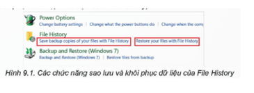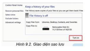 Bước 1. Truy cập Control Panel rồi chọn System and Security. Trong mục File History (Hình 9.1) có hai chức năng là Save backup copies of your files with File History (lưu bản sao các tệp của bạn với File History) và Restore your files with File History (khôi phục các tập của bạn với File History).