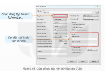 Bước 2. Sau khi cài đặt xong, tìm tập/thư mục muốn nén. Nháy nút phải chuột vào tập/thư mục đó và chọn “7-Zip” trong bảng chọn xuất hiện. Chọn "Thêm vào tệp nén Add to archive” để mở cửa sổ Thêm vào tệp nén (Hình 9.16).