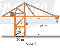 Trên cần trục ở Hình 5, hai trụ a và b đứng cách nhau 20 m, hai xà ngang c và d lần lượt có độ cao 20 m và 45 m so với mặt đất. Xà chéo x có độ dài bao nhiêu mét (kết quả làm tròn đến hàng đơn vị)?