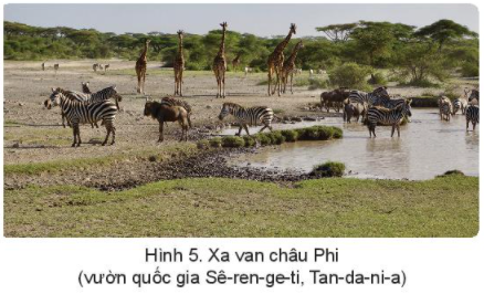 - Thực vật: rừng thưa xavan, cây bụi. - Động vật: động vật ăn cỏ (ngựa vằn, sơn dương, hươu cao cổ…) và động vật ăn thịt (sư tử, báo gấm…). |