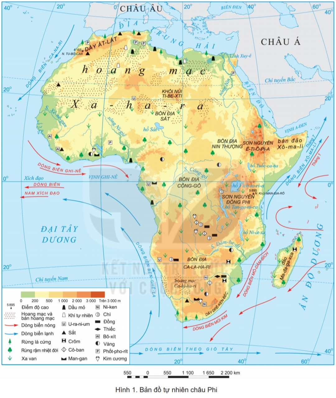 - Quan sát hình 1 (Đọc bảng chú giải để biết được kí hiệu và tên các loại khoáng sản chính ở châu Phi, sau đó xác định trên bản đồ vị trí phân bố các loại khoáng sản đó).