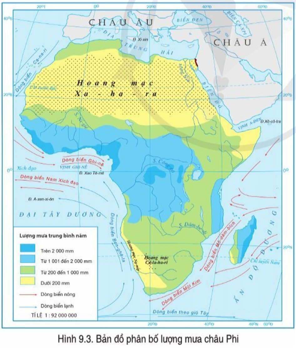 - Dòng biển lạnh Ca-na-ri chảy ven bờ Tây Bắc của châu Phi, dòng biển lạnh Ben-ghê-lachảy ven bờ Tây Nam châu Phi, lượng mưa vùng ven biển này thường dưới 200 mm.