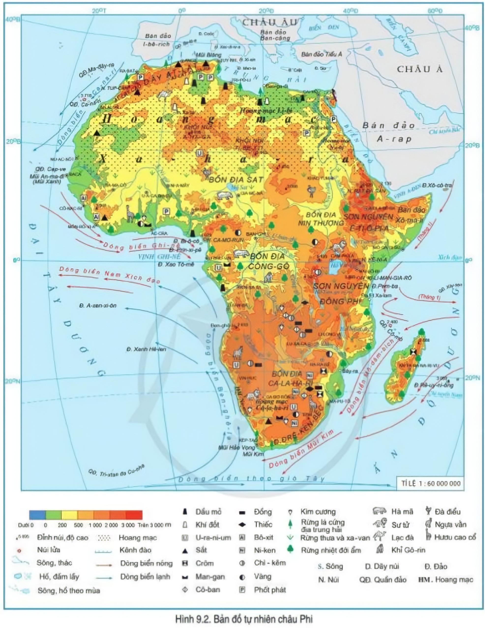 - Xác định các sơn nguyên, bồn địa, các dãy núi của châu Phi.