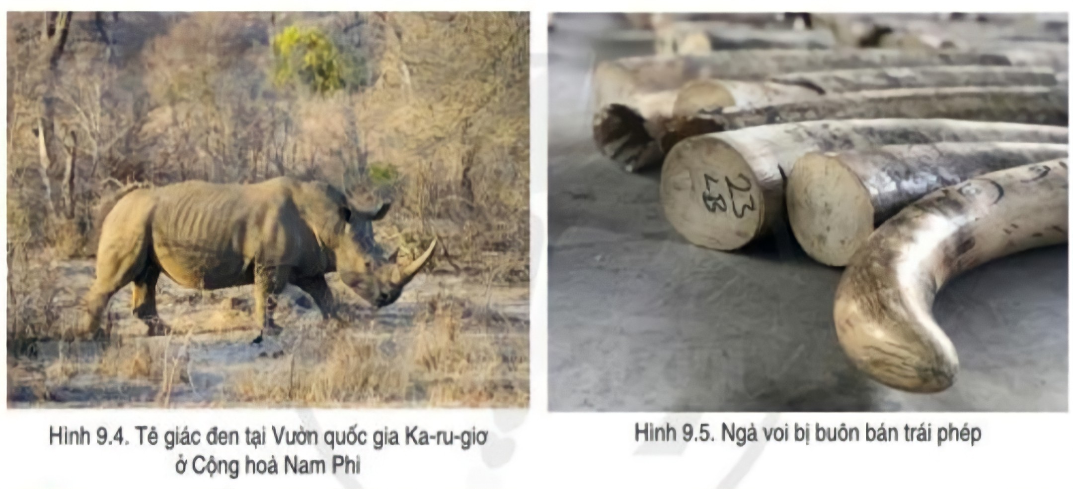 Đọc thông tin và quan sát hình 9.4, hình 9.5, hãy cho biết vì sao nạn buôn bán trái phép sừng tê giác đen và ngà voi lại phổ biến trên thế giới.
