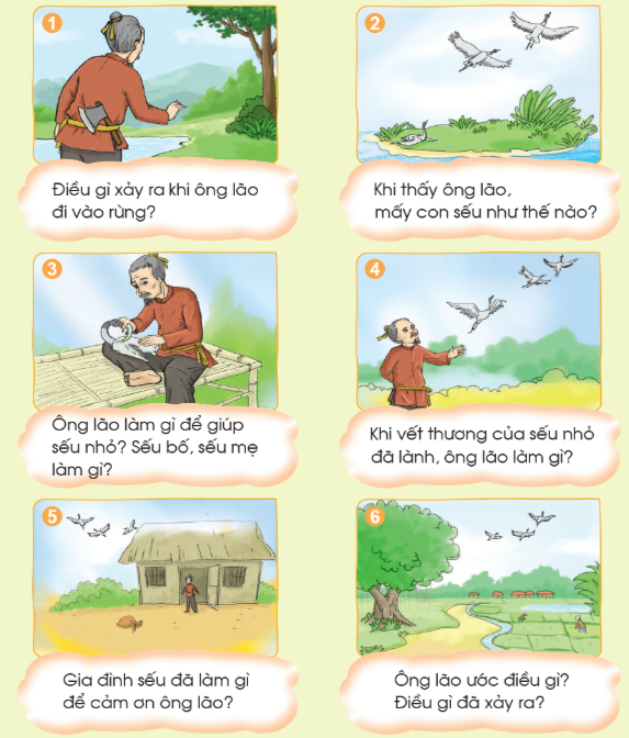 Tranh 3: Ông ôm sếu về nhà băng bó, chăm sóc. Ngày ngày, sếu bố, sếu mẹ bay đến nhà ông kêu: “cíu ca, cíu ca” lo lắng.