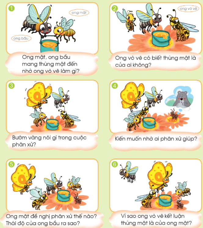 Tranh 1: Ong mật và ong bầu cùng mang một thùng mật đến nhờ ong vò vẽ phân xử. Hai bên đều nói đấy là mật của mình.
