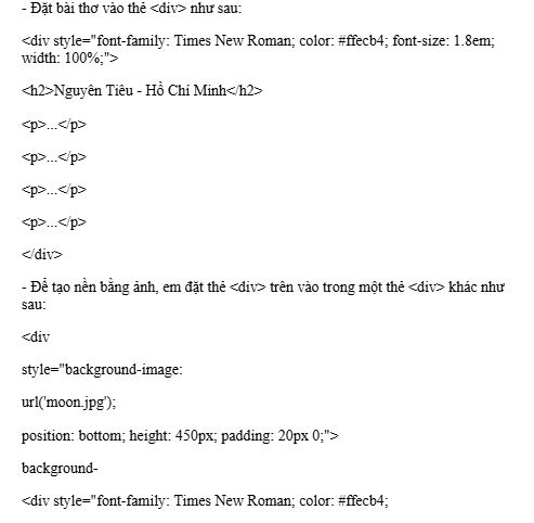 a) Thiết đặt phông chữ Times New Roman, cỡ chữ lớn và màu sắc tuỳ ý. b) Tạo nền cho bài thơ gốc là một tệp ảnh tuỳ ý tìm trên Internet sao cho có những hình ảnh liên quan đến nội dung bài thơ.