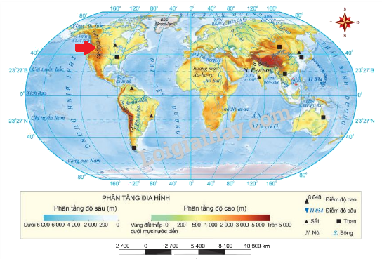 Hình 2.2. Bản đồ địa hình và sự phân bố một số mỏ sắt, mỏ than trên thế giới.