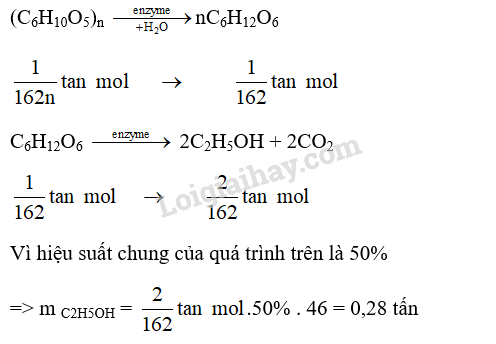 Biết hiệu suất chung của quá trình trên là 50%. Viết phương trình hóa học của các phản ứng theo sơ đồ trên. Tính khối lượng ethylic alcohol thu được từ 1 tấn tinh bột.