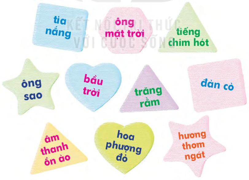 - Nhìn thấy: tia nắng, ông mặt trời, ông sao, bầu trời, trăng rằm, đàn cò, hoa phượng đỏ.