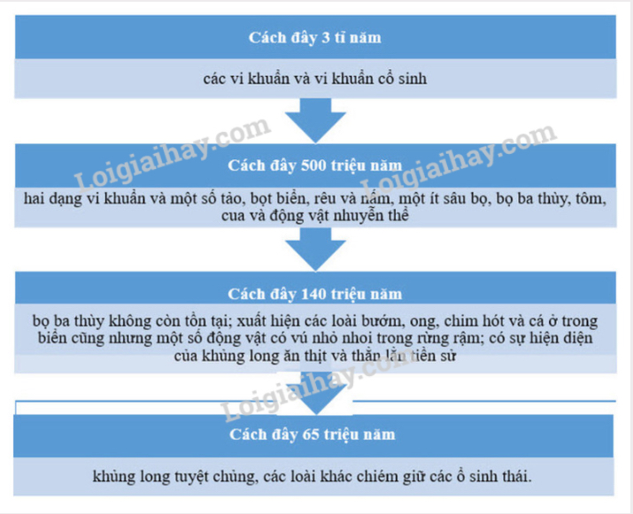 Viết sơ đồ tóm tắt đặc điểm các giai đoạn phát triển sự sống trên Trái Đất.