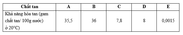 Khả năng hoà tan của các chất ở 20 °C: E < C < D < A < B.