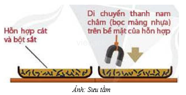 Ngoài cách lọc, cô cạn, chiết, ta còn có thể sử dụng nhiều cách khác để tách chất ra khỏi hỗn hợp. Ví dụ, người ta có thể tách cát và sắt ra khỏi hỗn hợp của chúng bằng cách sử dụng một thanh nam châm được bọc màng nhựa như hình trên. Khi đó, sắt bị nam châm hút còn cát không bị thanh nam châm hút. Do đinh sắt hoặc các vật nhỏ bằng sắt bị nam châm hút. Do đó có thể dùng nam châm để gom đinh sắt và các vật nhỏ bằng sắt.