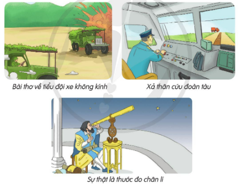 Quan sát tranh và đọc tên các bài thơ, câu chuyện dưới đây. Hãy đoán xem bài thơ, câu chuyện ấy nói về hành động dũng cảm nào? Trao đổi về một số biểu hiện về lòng dũng cảm ở học sinh. Bài thơ về tiểu đội xe không kính. Các chiến sĩ trong bài thơ làm nhiệm vụ gì. Những chiếc xe của họ có gì khác thường. Vì sao. Tìm những hình ảnh, từ ngữ nói lên sự khó khăn, nguy hiểm mà các chiến sĩ phải trải qua. Thái độ của các chiến sĩ trước khó khăn, nguy hiểm được miêu tả ở mỗi khổ thơ nói lên điều gì. Chủ
