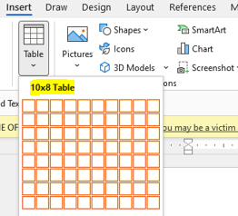 Sử dụng lệnh Insert/Table rồi dùng chuột kéo thả để chọn số cột và số hàng thì số cột, số hàng tối đa có thể tạo được là:
