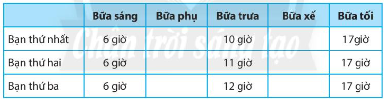 Trong cách phân chia các bữa ăn của 3 bạn dưới đây, cho biết bạn nào cần bổ sung bữa ăn phụ hoặc bữa ăn xế. Nên bổ sung các bữa ăn đó vào khoảng thời gian nào?