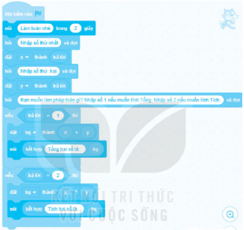 Nếu trả lời bằng 2 thì gán tích x * y vào biến kq nên kq là 200. Thông báo Tích hai số là 200.