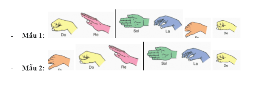 Em hãy chọn các hình dán kí hiệu nốt nhạc bàn tay Đô, Rê, Pha, Son, La, Đố dán vào ô trống để tạo hai mẫu 5 âm và tự thể hiện.