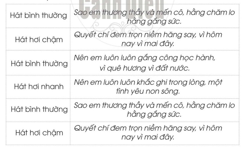 Hát những câu sau trong bài Em thương thầy mến cô với tốc độ nhanh - chậm khác nhau