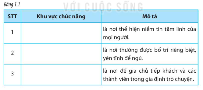 Hãy điền tên những khu vực chức năng trong ngôi nhà tương ứng với những mô tả trong Bảng 1.1