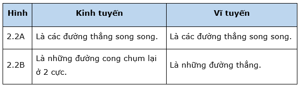 Hãy nêu sự khác biệt về hình dạng lưới kinh, vĩ tuyến trên hình 2.2A và hình 2.2B.