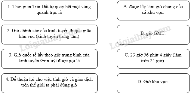 1. Thời gian Trái Đất tự quay hết một vòng quanh trục là 23 giờ 56 phút 4 giây (làm tròn 24 giờ).