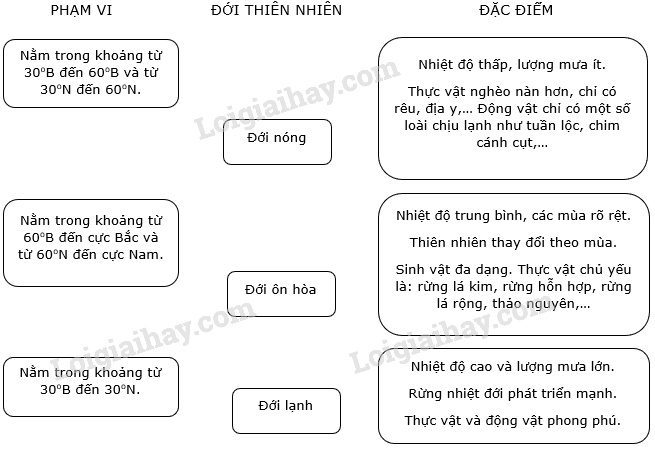 Hãy nối ô ở giữa với ô bên trái và ô bên phải sao cho hợp lí khi nói về phạm vi và đặc điểm của các đới thiên nhiên trên Trái Đất.