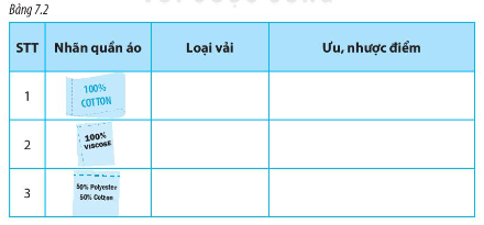 Đọc những nhãn quần áo trong Bảng 7.1 và cho biết trang phục đó được làm từ loại vải nào. Nêu ưu, nhược điểm của loại vải đó