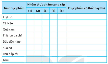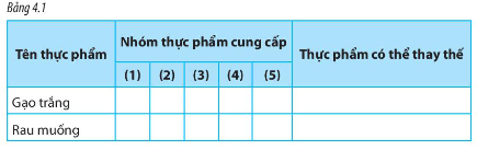 Hãy đánh dấu √ và điền tiếp vào ô trống trong Bảng 4.1 để nêu rõ những món ăn sau cung cấp các chất dinh dưỡng nào, các món ăn có thể thay thế để tạo nên sự đa dạng trong các bữa ăn