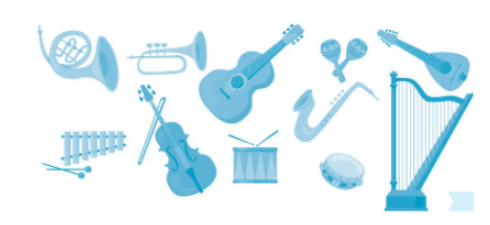 + Hàng trên: Kèn cor (French horn), Trumpet, Guitar, Saxophone, Maraca, Madolin