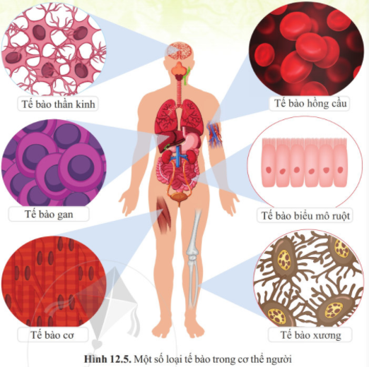 Tế bào cấu tạo nên cơ thể người: tế bào thần kinh, tế bào xương, tế bào cơ, tế bào gan. tế bào hồng cầu, tế bào biểu mô ruột