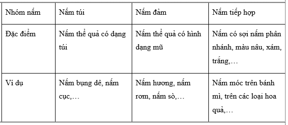 Lập bảng để phân biệt các nhóm nấm. (tên, nhóm nấm, đặc điểm, ví dụ đại diện)