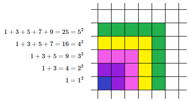 \(1 + 3 + 5 + ... + (2n - 1) = {n^2}\quad (1)\)
