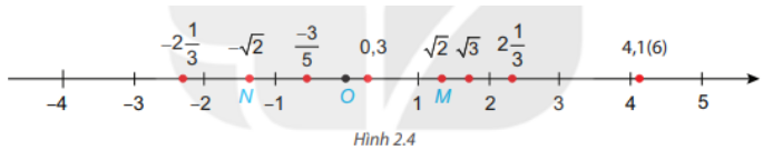 Điểm nào trong Hình 2.4 biểu diễn số \( - \sqrt 2 \)? Em có nhận xét gì về điểm biểu diễn của hai số đối nhau?
