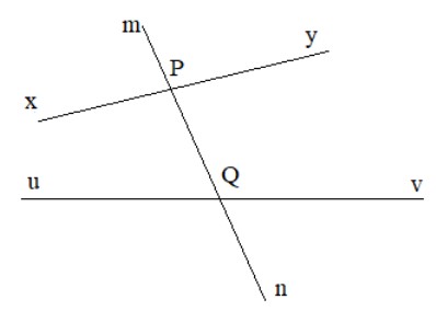 Cho đường thẳng mn cắt đường thẳng xy và uv lần lượt tại hai điểm P và Q (H.3.17).Em hãy kể tên: