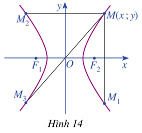 Trong mặt phẳng tọa độ \(Oxy\), ta xét hypebol (H) với phương trình chính tắc \(\frac{{{x^2}}}{{{a^2}}} - \frac{{{y^2}}}{{{b^2}}} = 1\) trong đó \(a > 0,b > 0\) (Hình 14). Cho điểm \(M\left( {x;y} \right)\) nằm trên hypebol (H). Gọi \({M_1},{M_2},{M_3}\) lần lượt là điểm đối xứng của M qua trục Ox, trục Oy và gốc O. Các điểm \({M_1},{M_2},{M_3}\) có nằm trên hypebol (H) không? Tại sao?