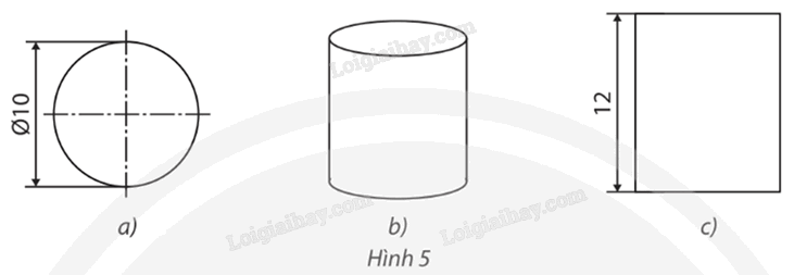 – Hình 5a là hình tròn có độ dài đường kính đáy bằng 10 cm nên nó là hình chiếu của hình trụ qua phép chiếu vuông góc có mặt phẳng chiếu song song với mặt đáy của hình trụ.